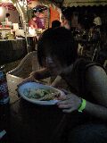 KENOBI様の選曲がツボにはまったし、スタッフの人にステージで踊れといきなり引きずりあげられたりでメチャメチャ楽しかった。 お腹がすいたのでフードコーナーへ。 このグリーンカレー、私が今まで食べたグリーンカレーの中でいちばん美味しかった。 具はものすごくなめらかな食感の厚揚げ豆腐、ゆでた(煮た?)ベビーコーンとレンコン、それに生のパプリカを小さめに切ったもの。 これらを辛めのグリーンカレーとごはんと一緒に口の中に入れると絶妙な食感と味がする。 確かDNAのTOMの奥さんだったと記憶している人が作ってた・・・あの夫婦ホントにいろんな所へ出没するなあ。