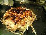 まず生地の半量をクレープ状に鉄板に伸ばす。 その上に薬味類を散らし、キャベツをのせ、豚肉を広げ、残りの生地をその上に振りかける。 その横にソバともやしを広げ、ソースを振りかけて炒める。 火力が強いのか油が少ないのか、ソバが鉄板にひっつき気味だ。 手早くしなくては・・・ソバの上に生地の豚肉側を下にして急いでのっける。