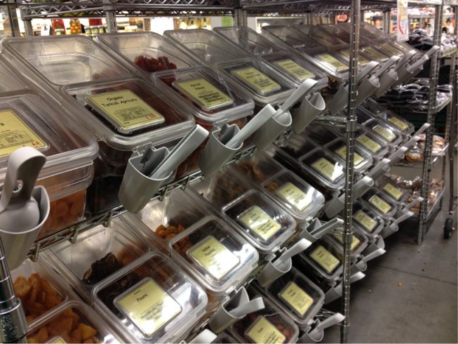 遠目に見るとなんだか肥料とかおがくずとか土とか、ホームセンターの資材売ってるような雰囲気だが、これは、シリアル、乾燥パスタ、ナッツ、ドライフルーツ、スパイスの売り場。スコップで掬ったり大きなビニール袋にどどどーとそれこそ肥料のように詰めて買う。