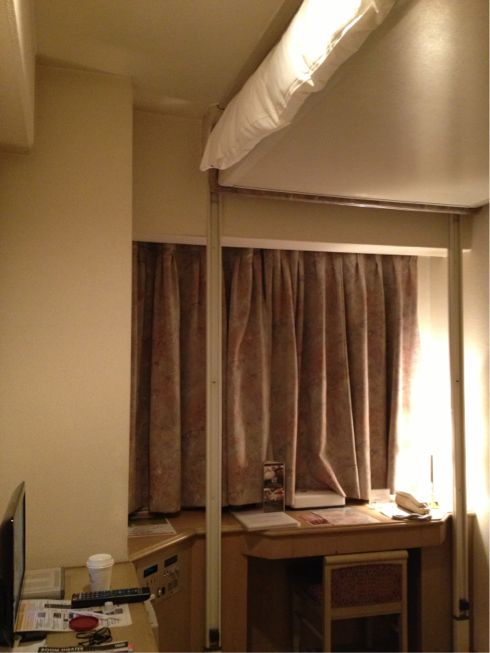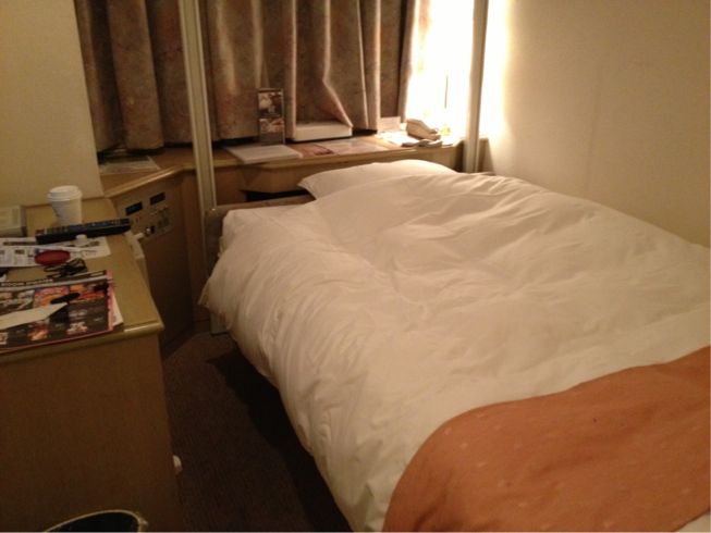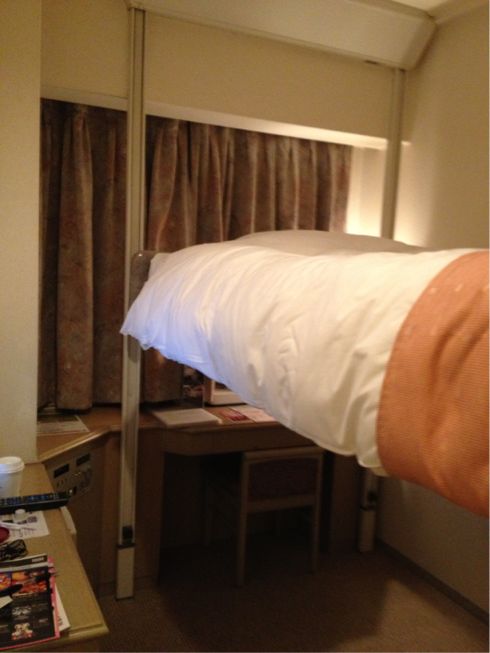 折角大阪まで来たんだし連休だしということでその夜はお泊り。一泊6000円の江坂にあるビジネスホテルなんだけど、部屋はベッドでスペースがいっぱいの狭さ。スイッチ一つでベッドが上下に可動して、上に上げておけば広く使える、という仕組みになっている。ベッドに乗ったまま稼働させてみたい衝動に駆られたが、スイッチに手が届かなくなってベッドと天井に挟まれて圧死、なんてことになったらヤバすぎるので、やむなくやめておく。