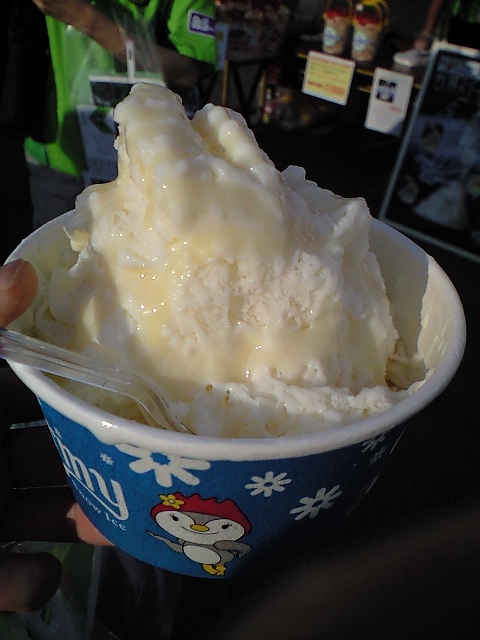 しっかしこの暑さはなんなんだ・・・夜7時からだし涼しくならないはずがないって思ってたのに・・・いつもほとんど手ぶら同然でスタジアムにやって来てしまう私(今日は大事なガイナーレタオルまで忘れた)とは対照的に、波平は今日も用意周到。(とはいっても毎回何かしらの忘れ物はあるみたいだけど・・・)各種スナック、ドリンク、双眼鏡、タオル、雨が降れば合羽に傘にベンチの雨水をふき取る雑巾、など快適便利に観戦するためのグッズがドラえもんのポケットのごとくリュックの中から次から次へと取り出される。 彼にとっての「命の水」赤ラベルのコカコーラの他に今日は暑さを見越して凍らせたスポーツドリンクに保冷剤まで用意(扇子を忘れたらしいけど)・・・おかんのようだ波平ちゃん。