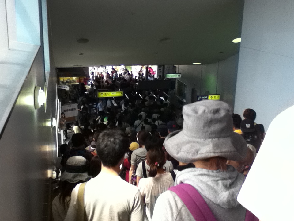 当日。 シャトルバスの出る桜島駅は朝からこんな感じ。 やっぱり服装はばっちりオシャレした子もいれば、マジでPTA奉仕活動ルックに1リットルのペットボトル2,3本とカロリーメイトが透けて見えるビニール袋を下げた気合い入りまくりのあんちゃんまで千差万別。