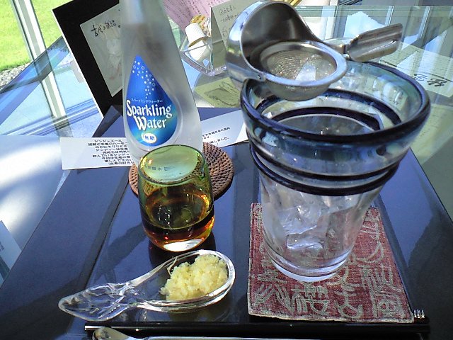 お蕎麦を食べたあと神社の前を横切って4年前にオープンした古代出雲歴史博物館へ。 そこのカフェでジンジャーエールをオーダーしたらこんなやつが運ばれてきたぞ・・・生の下ろし生姜を茶漉しに乗っけてその上から炭酸水を注ぎ入れ、黒糖蜜で甘みをつける、というもの。 これを美味しいと評してみんなにお薦めするかというとう~ん・・と躊躇してしまう。 通常のジンジャーエールを愛してやまない人にはもちろん薦めない。 けれど、例えばかずえちゃんみたいな、体にいいとされる食材を体にいいからと無理に、ではなくナチュラルに好む人には薦めるかもしれない。 私自身はというと、微妙だがしかしひょっとしたらまたオーダーするかも・・・でもほかにもちょっと興味深いメニューがいろいろあったのよ・・・蘇、とかいうアイスみたいなチーズみたいな食べ物とかね。 そっちも食べてみたいかも。