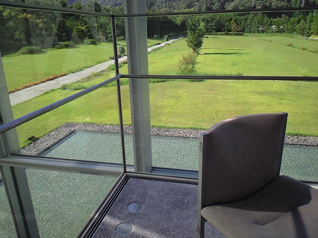 総ガラス張りのカフェの外側を、透明な水が張られたごくごく浅い堀が囲み、その向こうにシンプルな芝の庭が広がる。 水面が風によって刻々とその波形を変化させる。 ごくごく浅く堀が作られているというのには意味があると思う。 同じ周期をもつ波だと、水深が深いところより浅いところの方が波の伝わりが遅くなる。 つまりそよ風の様なごくごく弱いエネルギーによっておこった小さな波が、ゆっくり、くっきりとした波形を水面に刻んで進むことになる。 透過光も水底へ吸収されるということにならずに反射して、もっと波のコントラストを際立たせる。 そういったことが、ただの水面を、見る者に深い印象を与えるものに変えている。 シンプルで静謐な美しさ。 ずっと水面を眺めていて飽きない。 カフェのBGMはヘンデル。 バッハとかヘンデルとか、ああいうバロック系の音は端正で左右対称、みたいなすっきりした美しさがあって、意図したのかそうでないのか知らないが、なんだかその場の雰囲気にあまりにもハマっていた。 気持ち良すぎるなあ・・・建築家さんの意図にまんまと嵌められたかも。