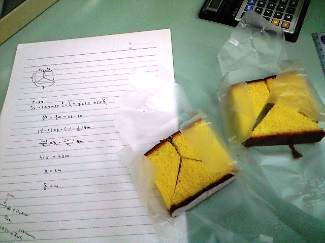 と、得意げに私は紙を見せた。 そこには長方形のカステラの縦をX、横をYとして、いずれも等しい面積の台形2つと三角形に切り分ける為の方程式が・・・