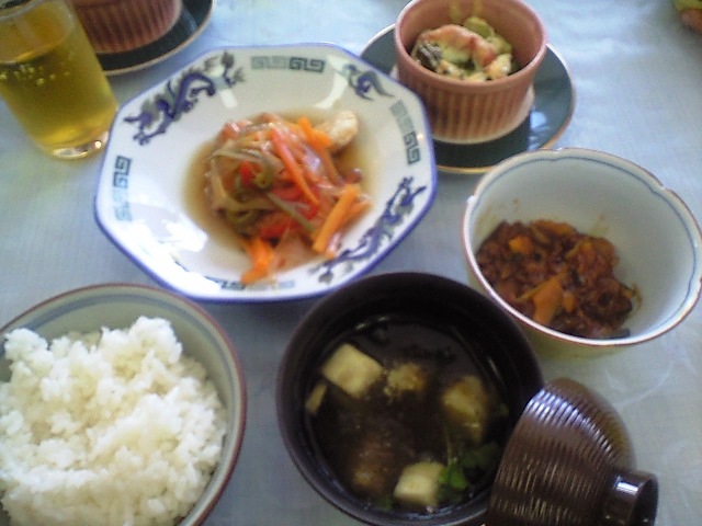 汁物の中のナスってクタクタに煮えたイメージがあって食感的にあまり好きでなかったけど、こんな風に焼ナス入れた方が美味しいかも。 生姜風味のかぼちゃも美味しかった。